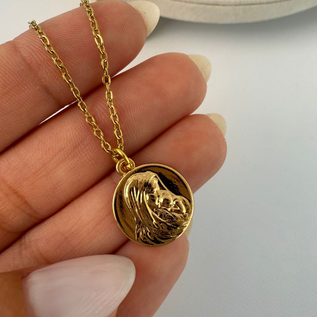 Collar Dorado Dije Virgen María con el Niño Jesús.