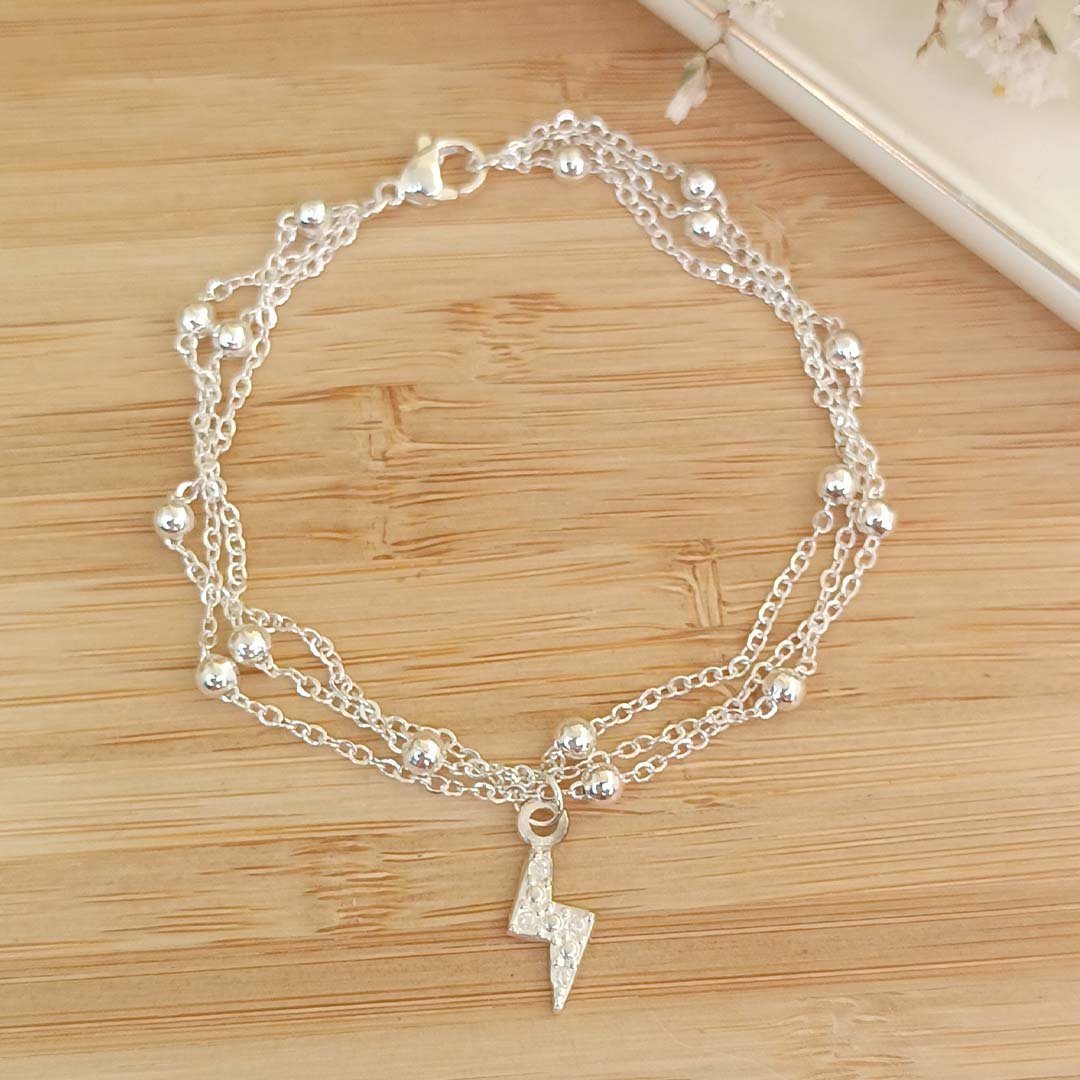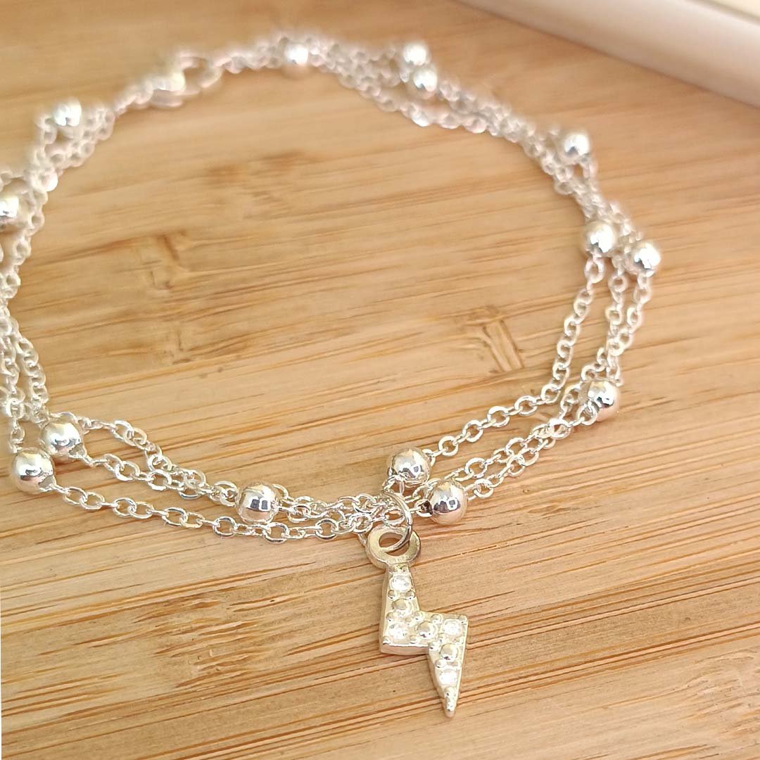 Pulsera Triple Cadena Forzada y Bolitas + Dije Rayo Con Piedritas En El Medio
