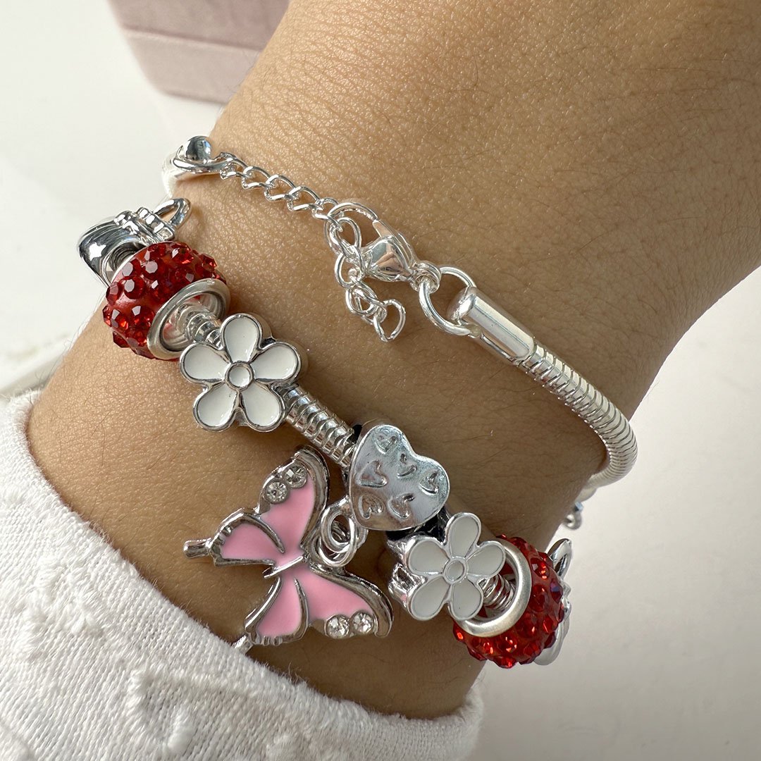 Pulsera Dupe - piedritas rojas + Dije Mariposa Rosado