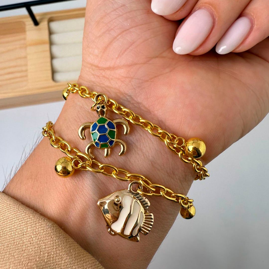 Pulsera Dorado con dijes de Tortuga y Pececito + Bolitas