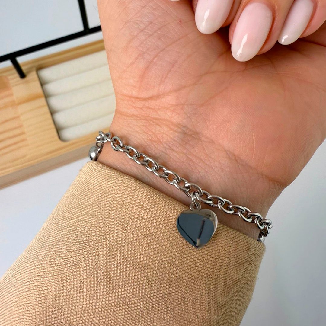 Pulsera Quirúrgica Cadena Gourmet + Dije en medio de Corazones
