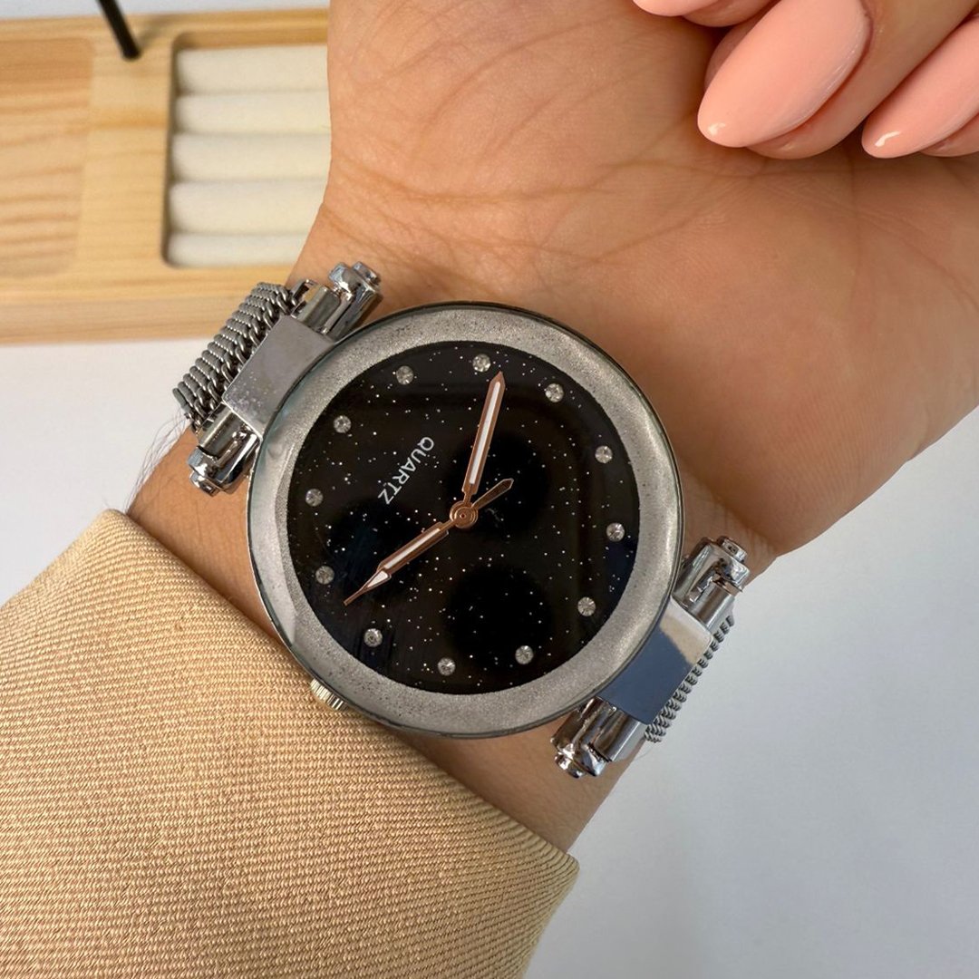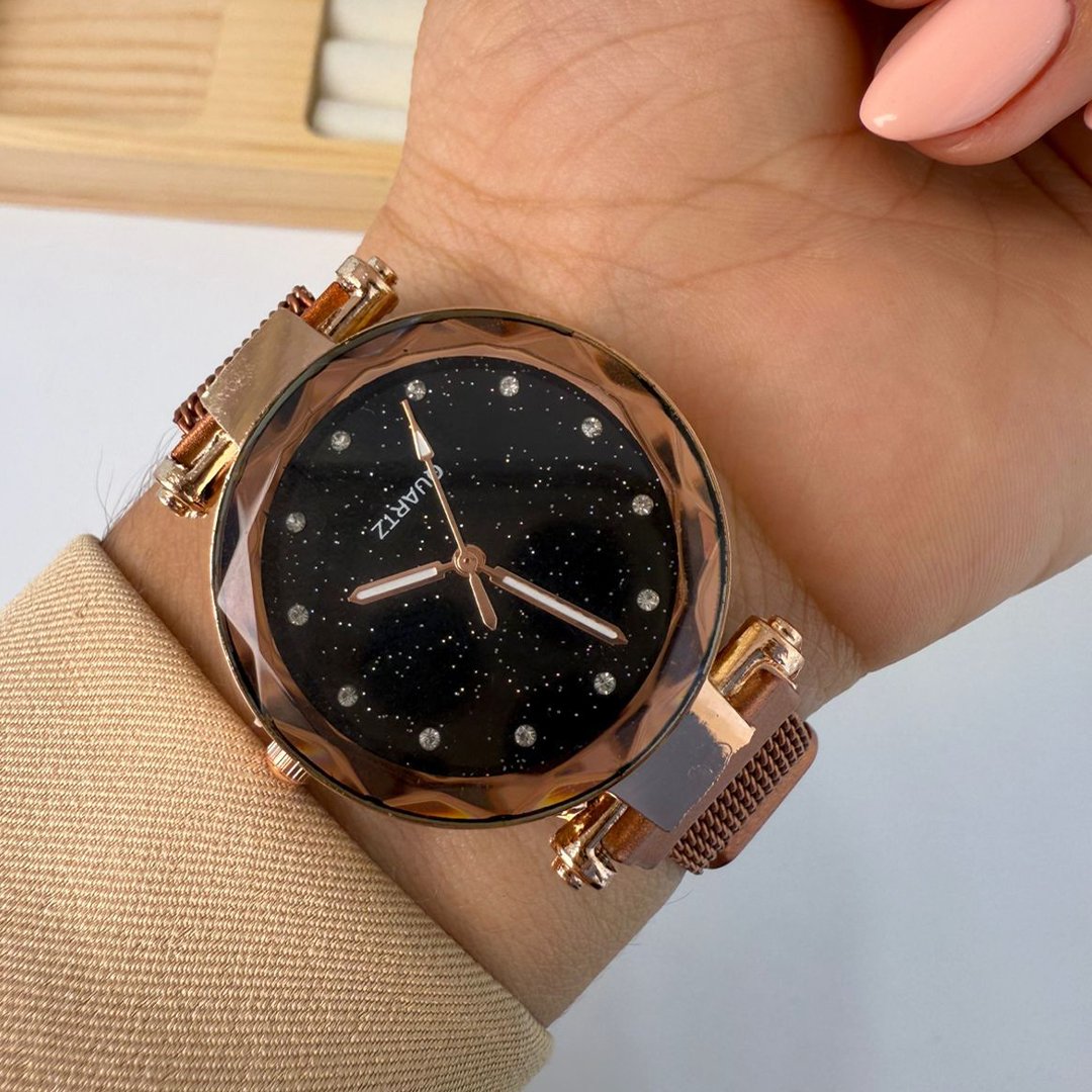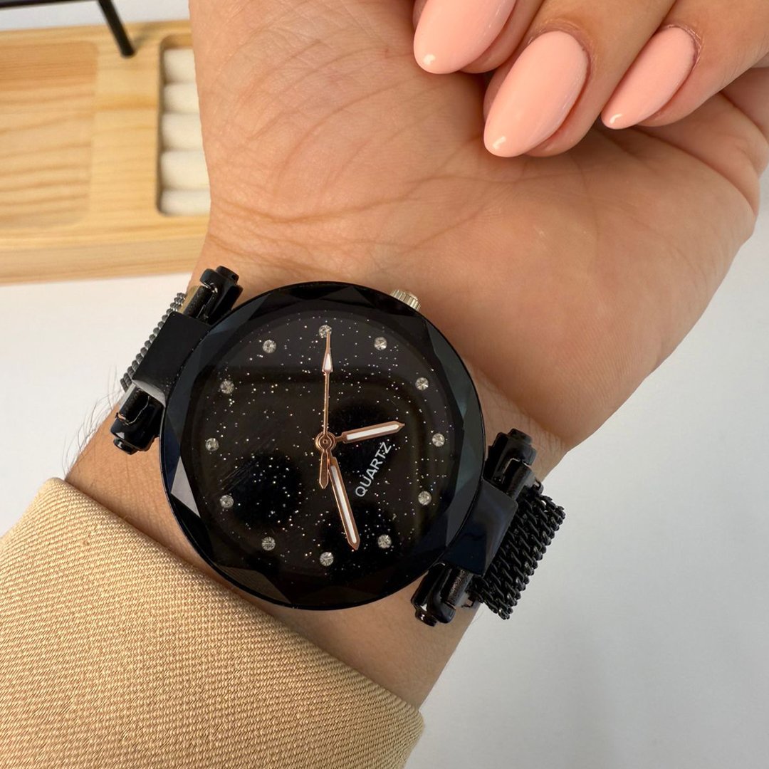 Reloj Dorado Mayani - Dial Negro -Piedritas Blancas