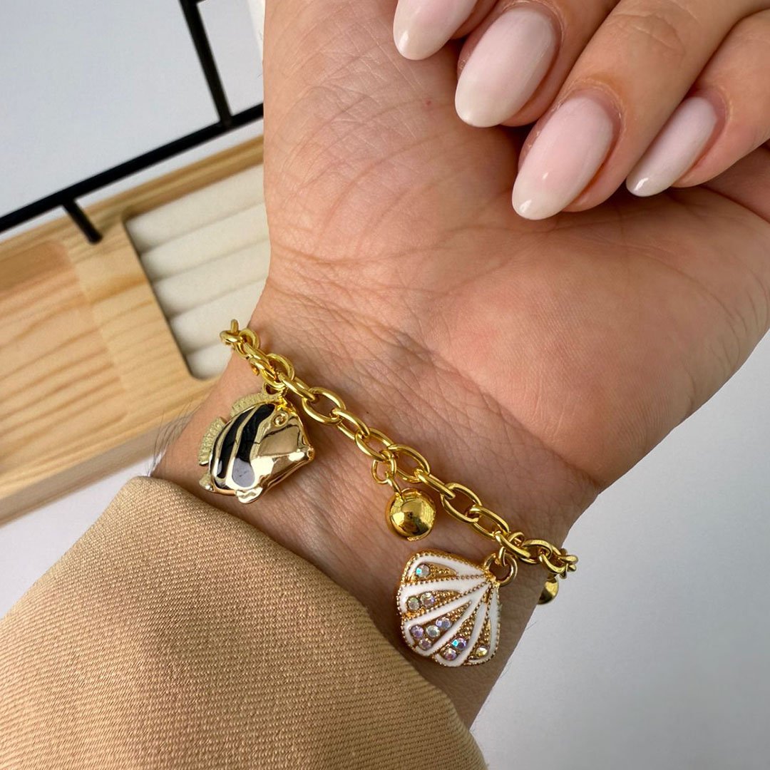 Pulsera Dorado Dijes Pez a rayas Negro / Ostra con Piedritas Tornasol