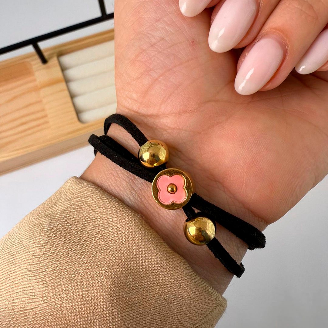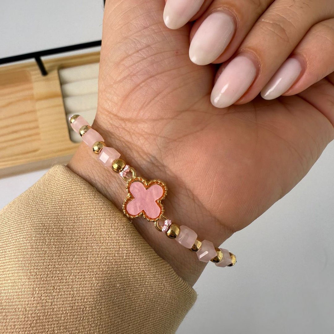 Pulsera de Hilo Trebol Rosado - Bolitas Doradas