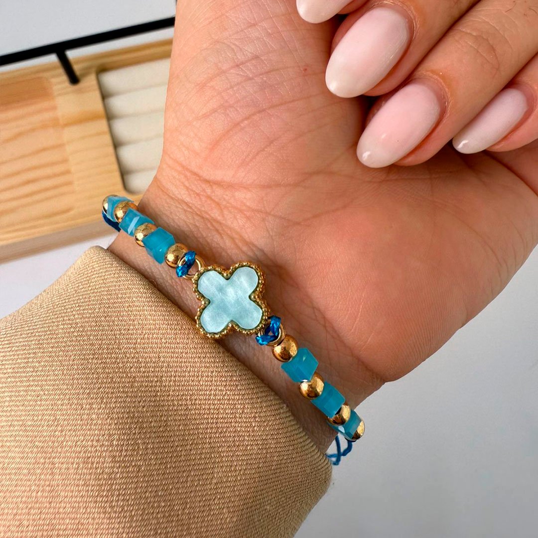 Pulsera de Hilo Trébol Celeste / Bolitas Doradas