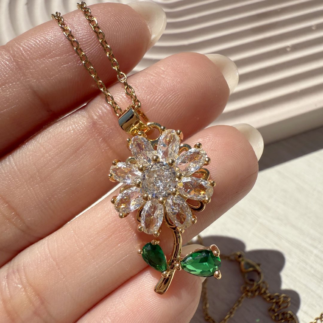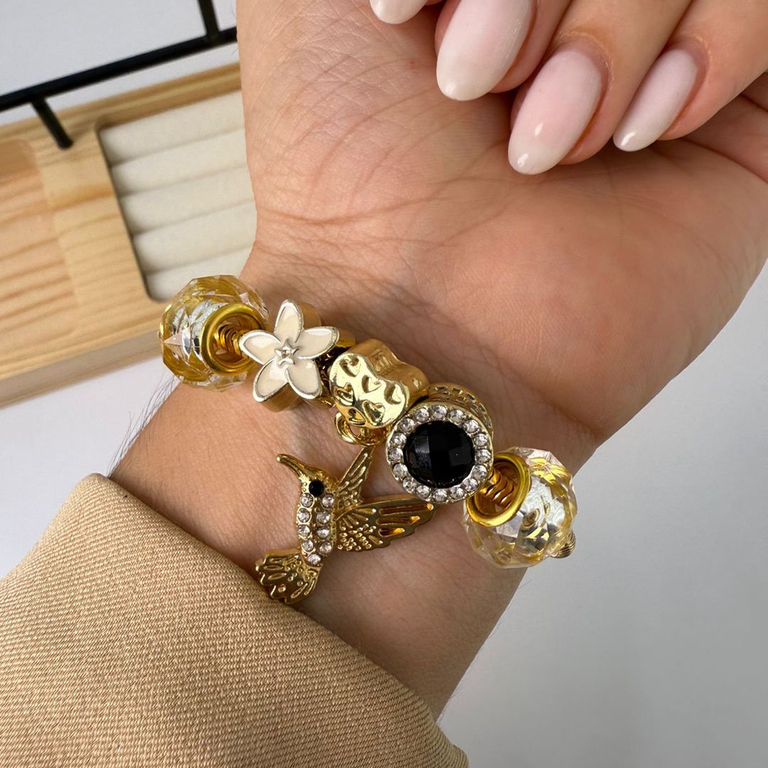 Pulsera Dorado Dijes Colibrí - Florcita Blanco - Piedra Negra