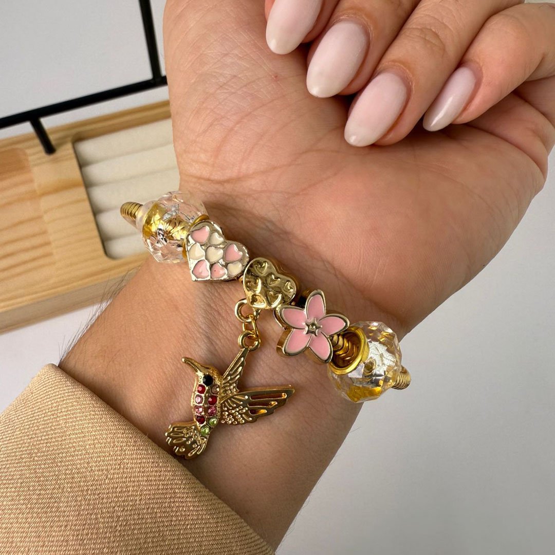 Pulsera Dorada Dijes Colibrí Piedritas Coloridas / Corazones / Florcita Rosita