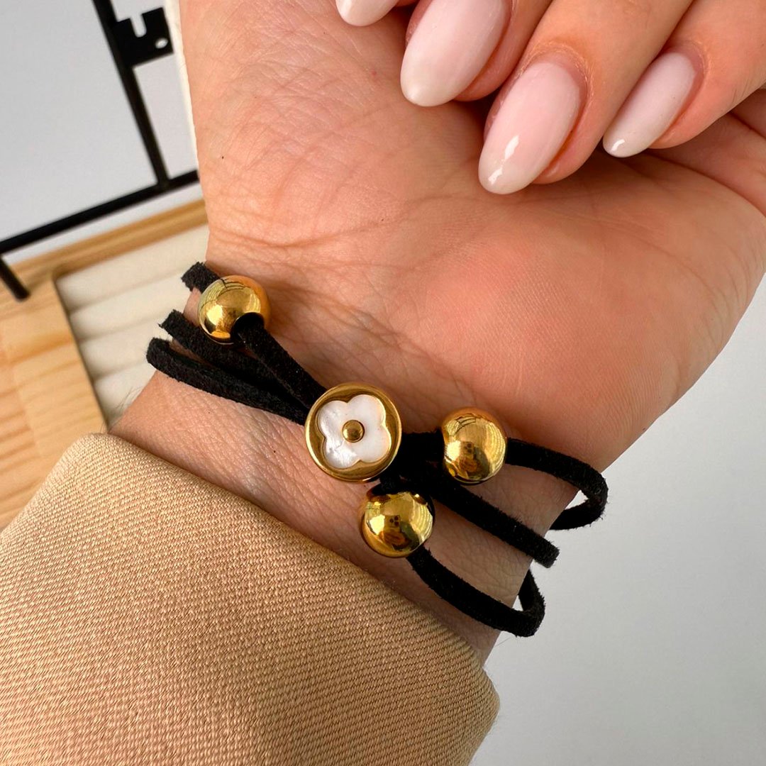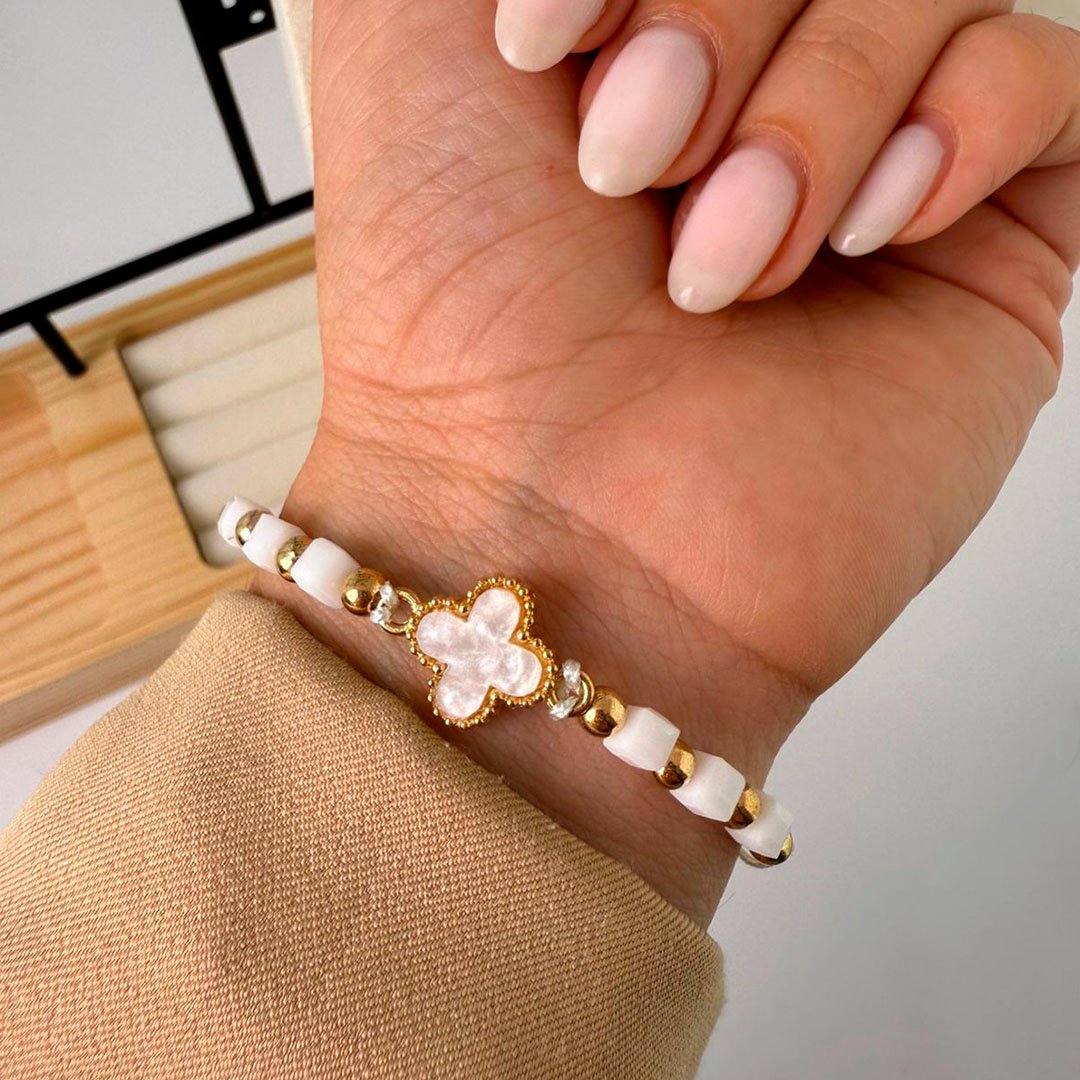 Pulsera de Hilo Trébol Blanco / Bolitas Doradas