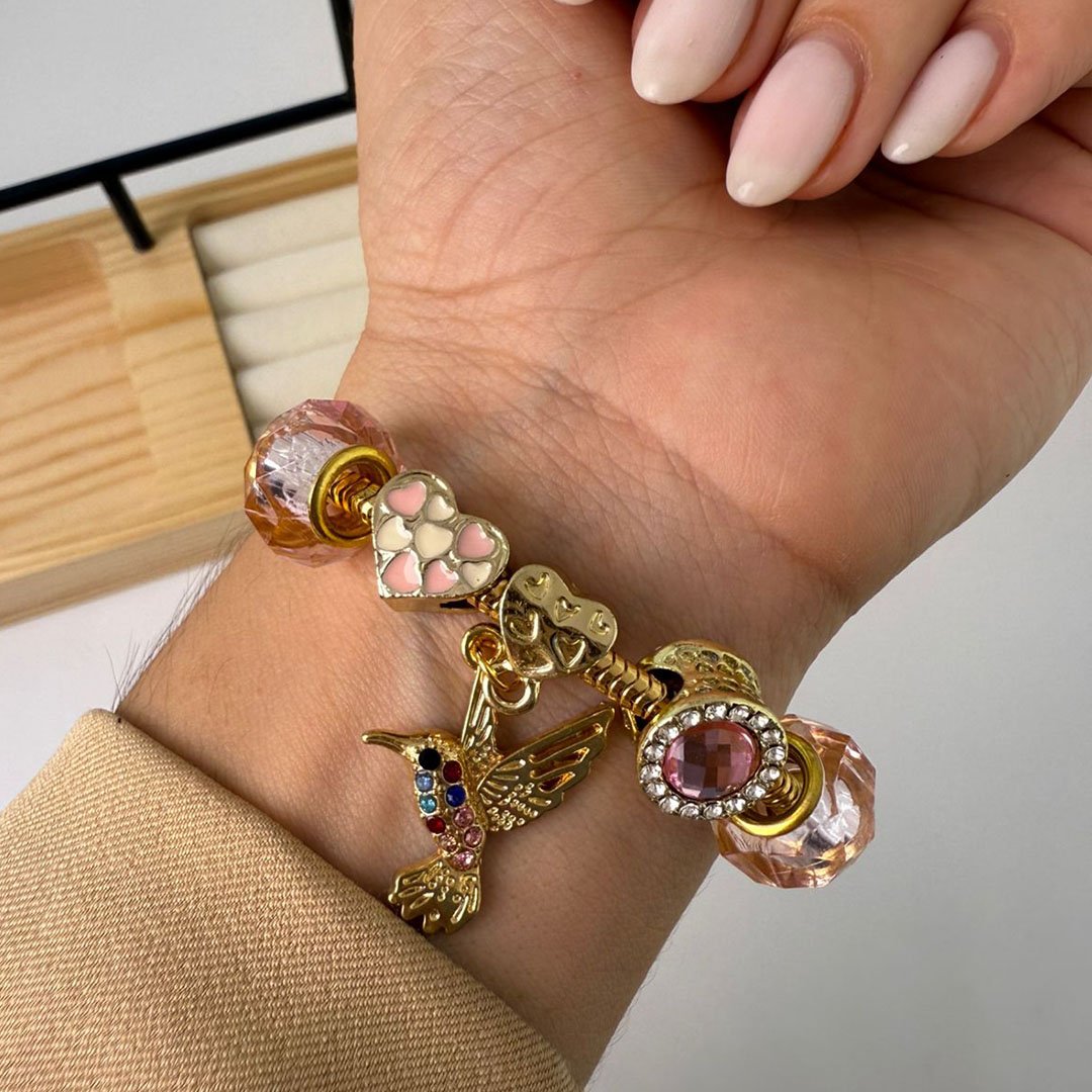 Pulsera Dorado Dije Colibrí Piedritas Coloridas / Piedra Rosado / Corazones