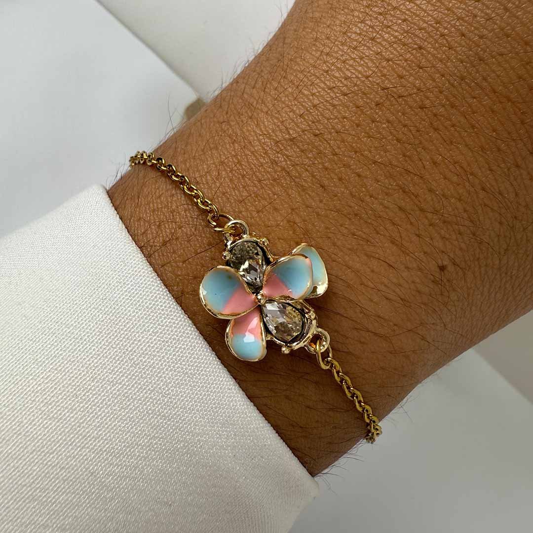 Pulsera Dorada Mariposa + cubo rosa + circulo tornasol en el medio