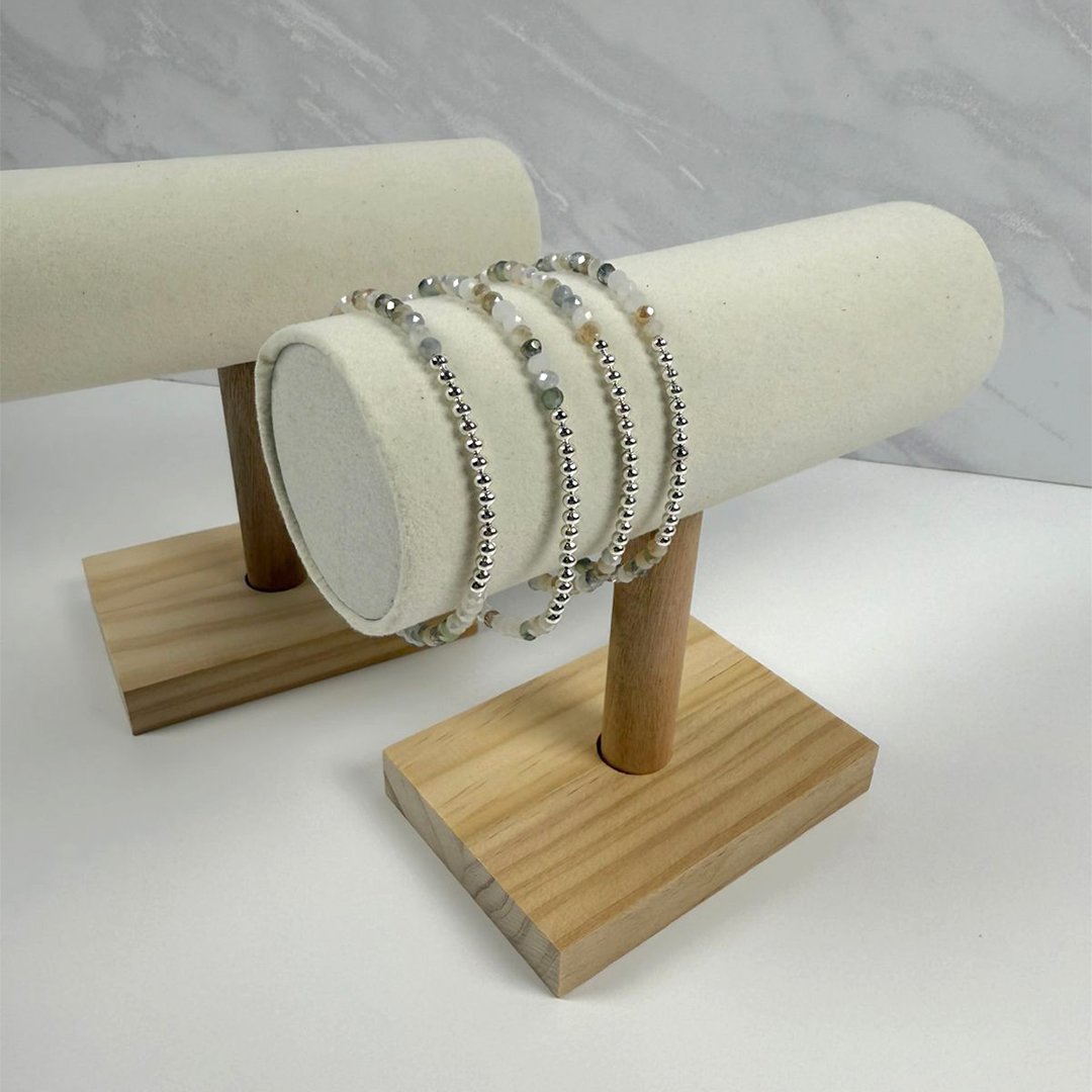 Tamaño :Ancho: 15cm- Alto: 14cm. Material : Madera , Gamuza. No incluye pulseras.