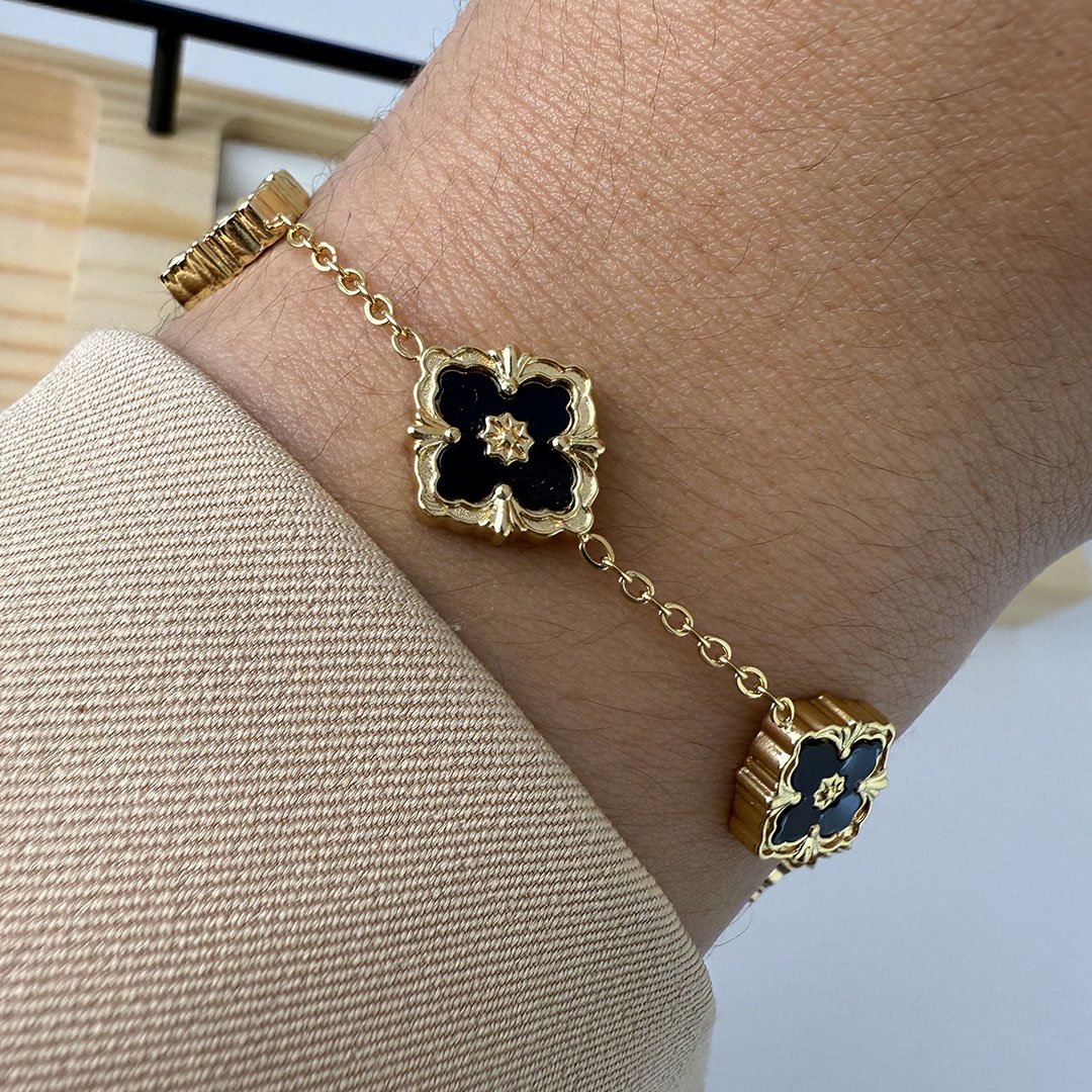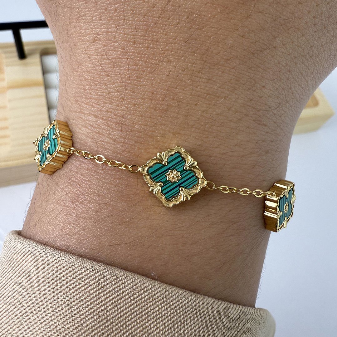 Pulsera Dorada con Tréboles Verde con detalle negro