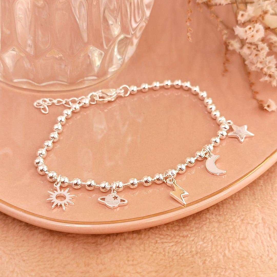 Pulsera Bolitas con dijes Sol + Saturno + Rayo + Luna + Estrella