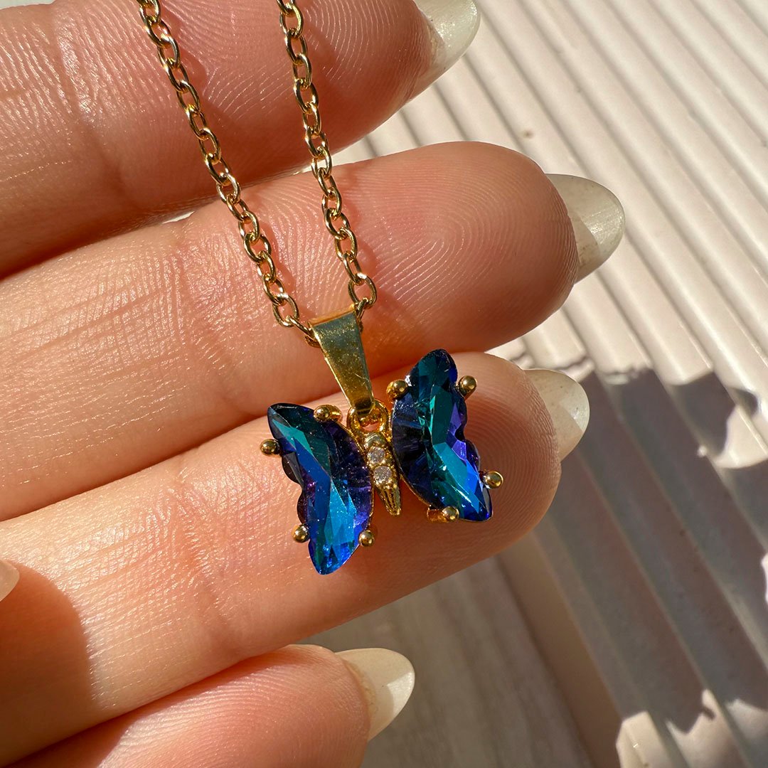 Acero Dorado Collares Collar dije Mariposa con piedritas Azul/ Celeste