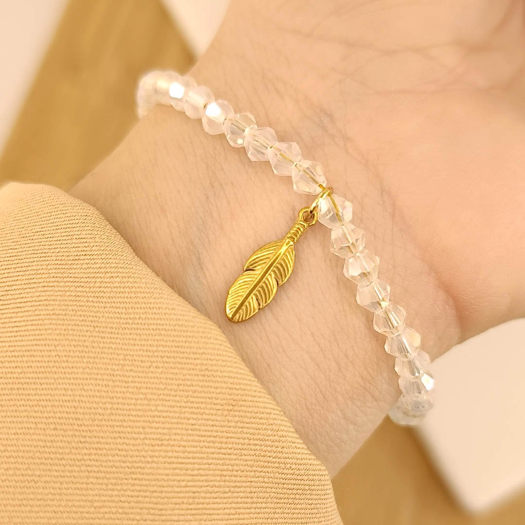 Acero Dorado Pulseras Pulsera piedritas blancas + dije Pluma Dorada