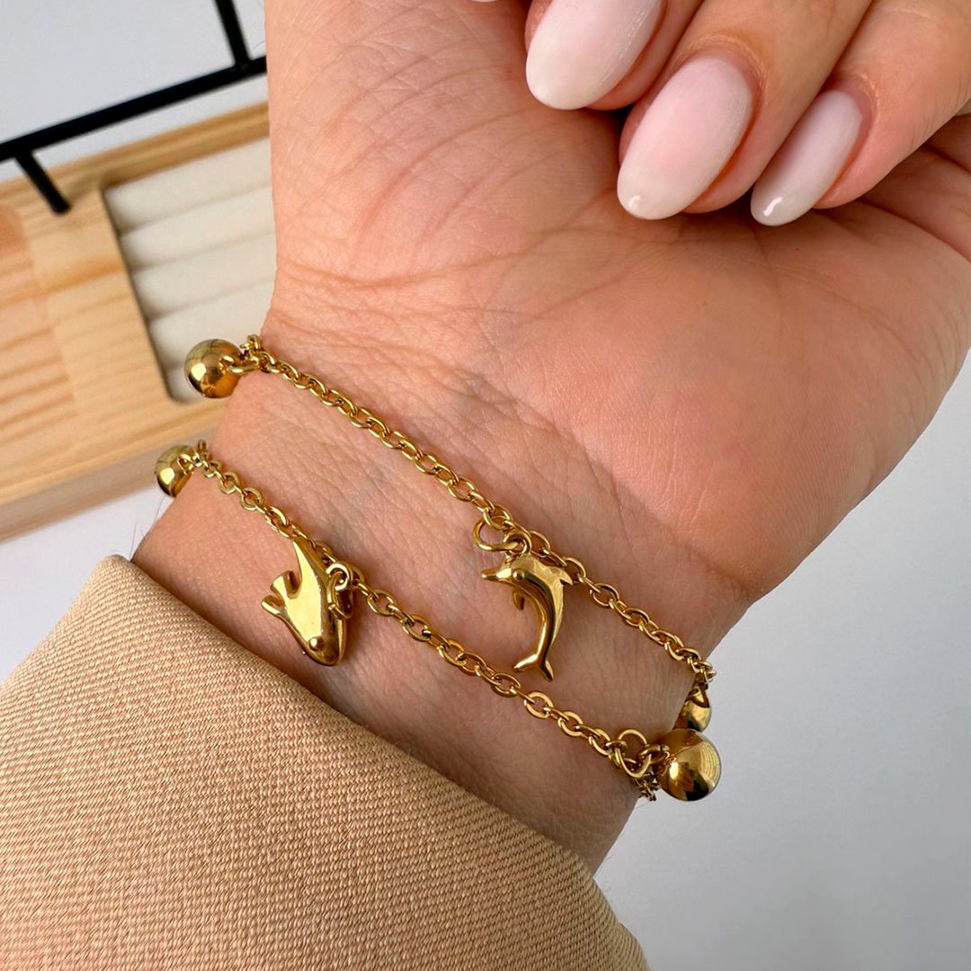 Tobillera Dorada Dijes Caballito de mar /Pez / Delfín + Bolitas
